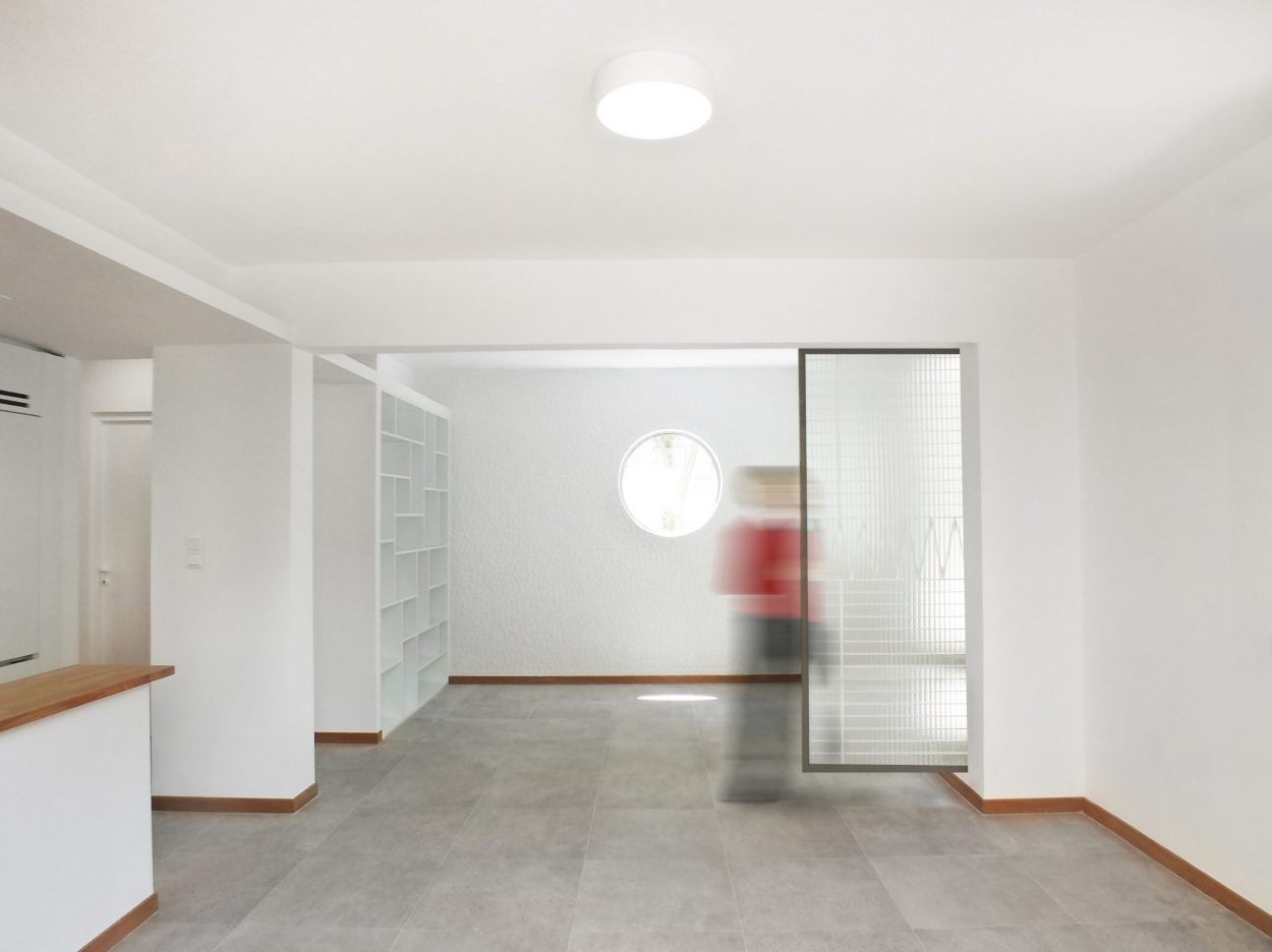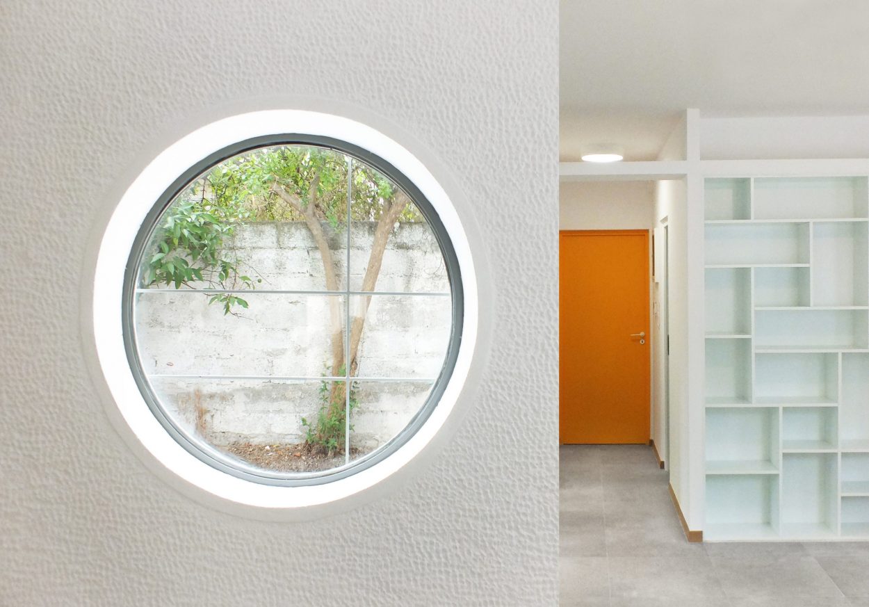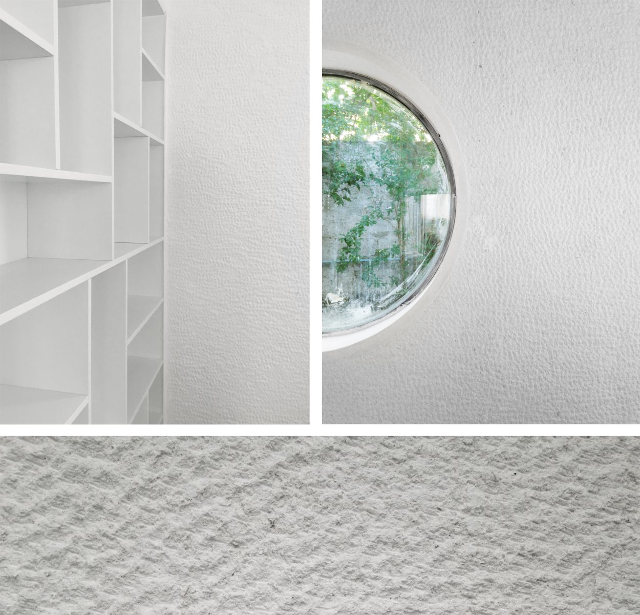 The house, build during 1972, is a typical for the era, detached structure surrounded by a courtyard. Several features on its exterior – telling of the 60’s and 70’s idiom used on the era’s suburbia housing- were utilized as a starting point, for the unfolding of the inner spaces. Complex ironworks on the openings, circular windows and corduroy glasses were used, with the main material focus of the interior, centered around a newly applied, handcrafted artifisiel wall, framing the view of an existing tree on the outer courtyard.