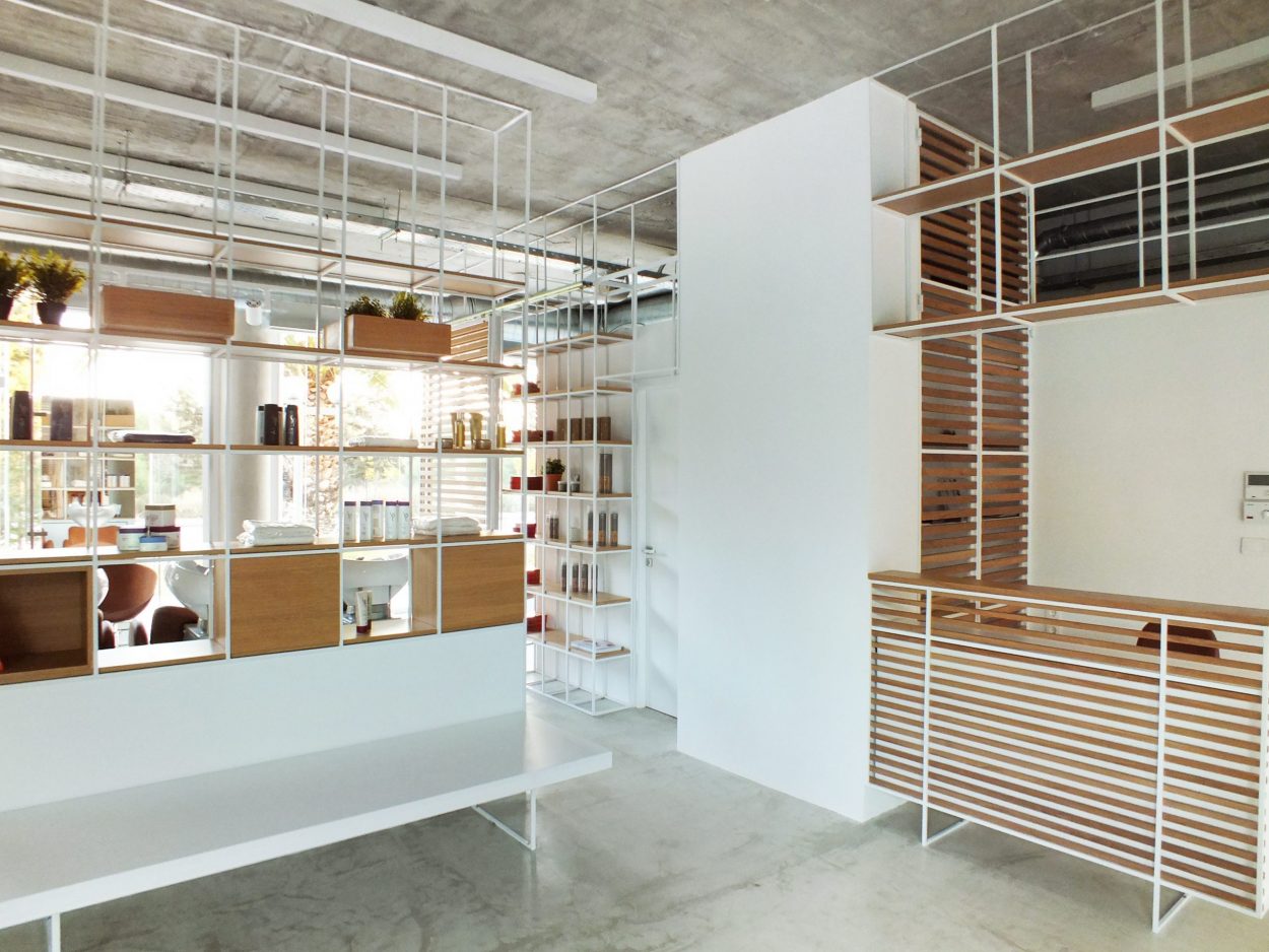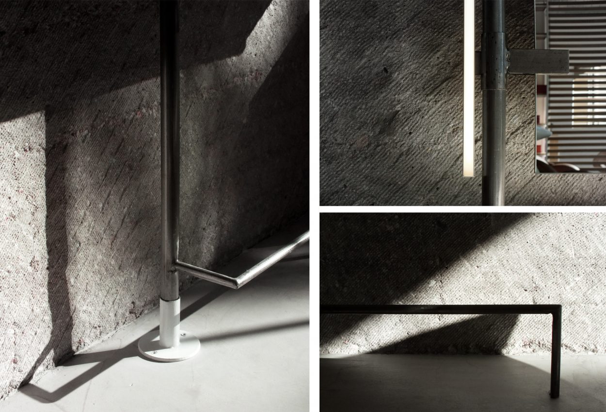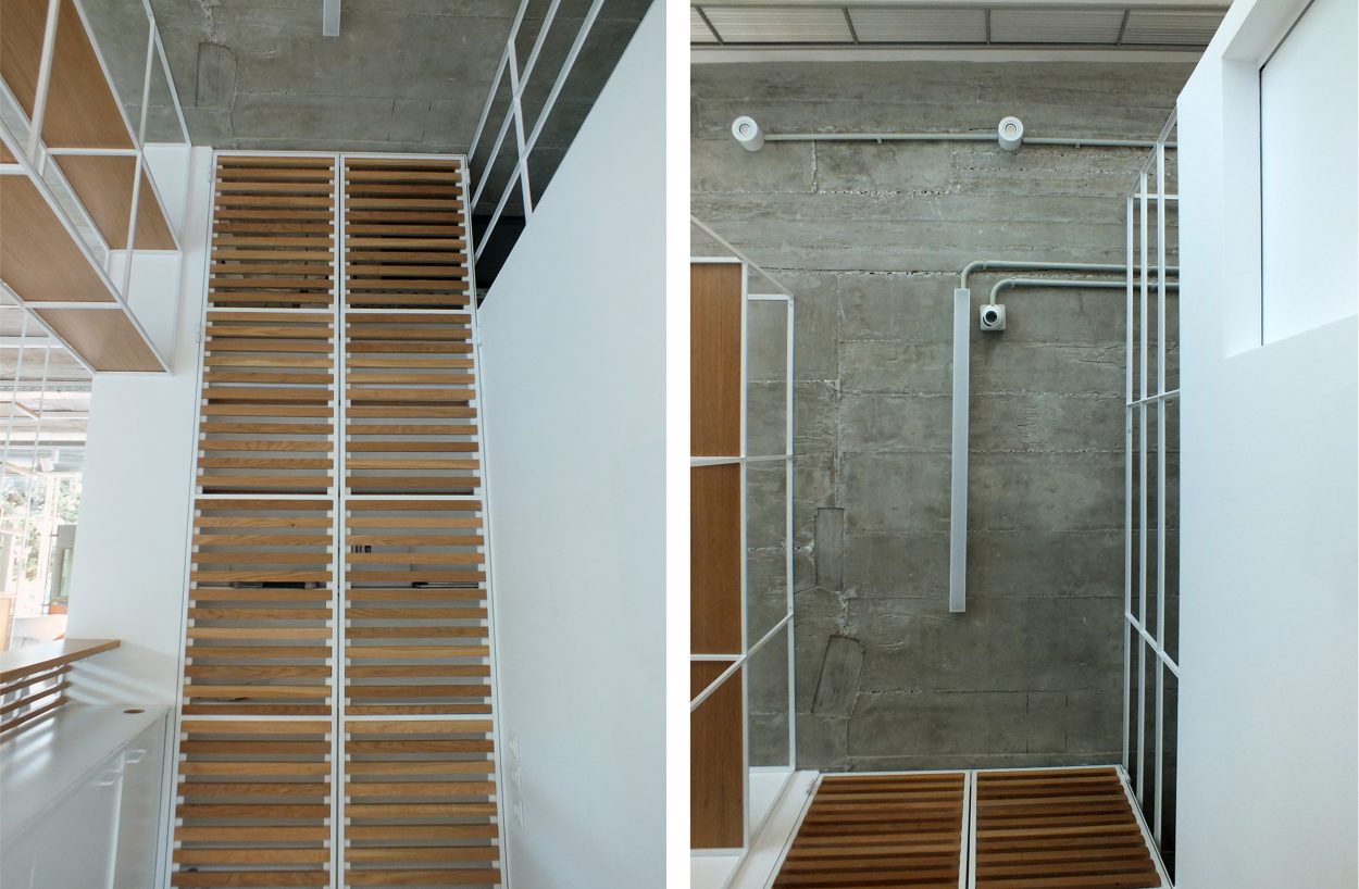 It was decided during the main review of the space, that the concrete on the ceiling and sidewall should be revealed. The ceiling was kept in its bare form, with the electrical and mechanical installations running exposed, in organized formation. The sidewall was hammered in order to remove all the pre-existing plaster markings, as well as exposing the gravels within, emphasizing on its sculptural quality and materiality. These gestures shaped the boundaries and main features of the containing shell. The internal space was conceived as a metal web, expanding in all directions, forming the divisions and functions required. A sort of multifunctional furniture containing space and its uses. Thus, keeping it as open as possible, maintaining its transparency, while allowing the natural light (a prominent feature of the space), to flow through it freely, through the use of permeable – lightweight structures and movable partitions, dividing space whenever necessary.
