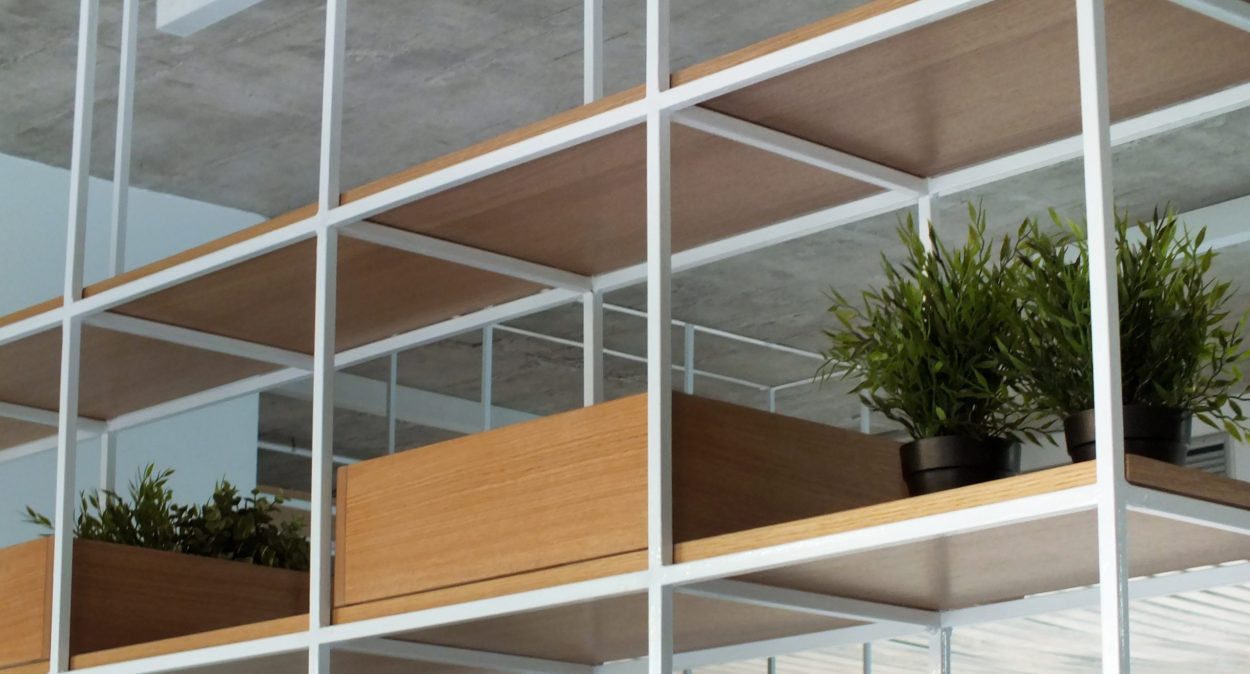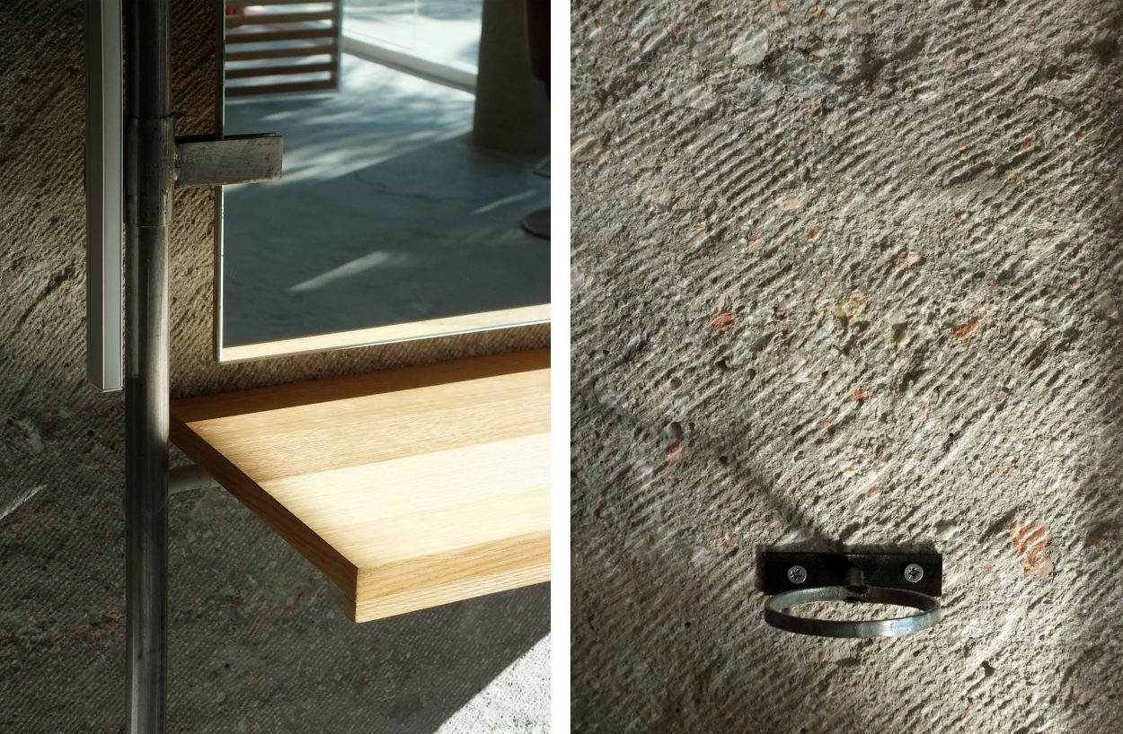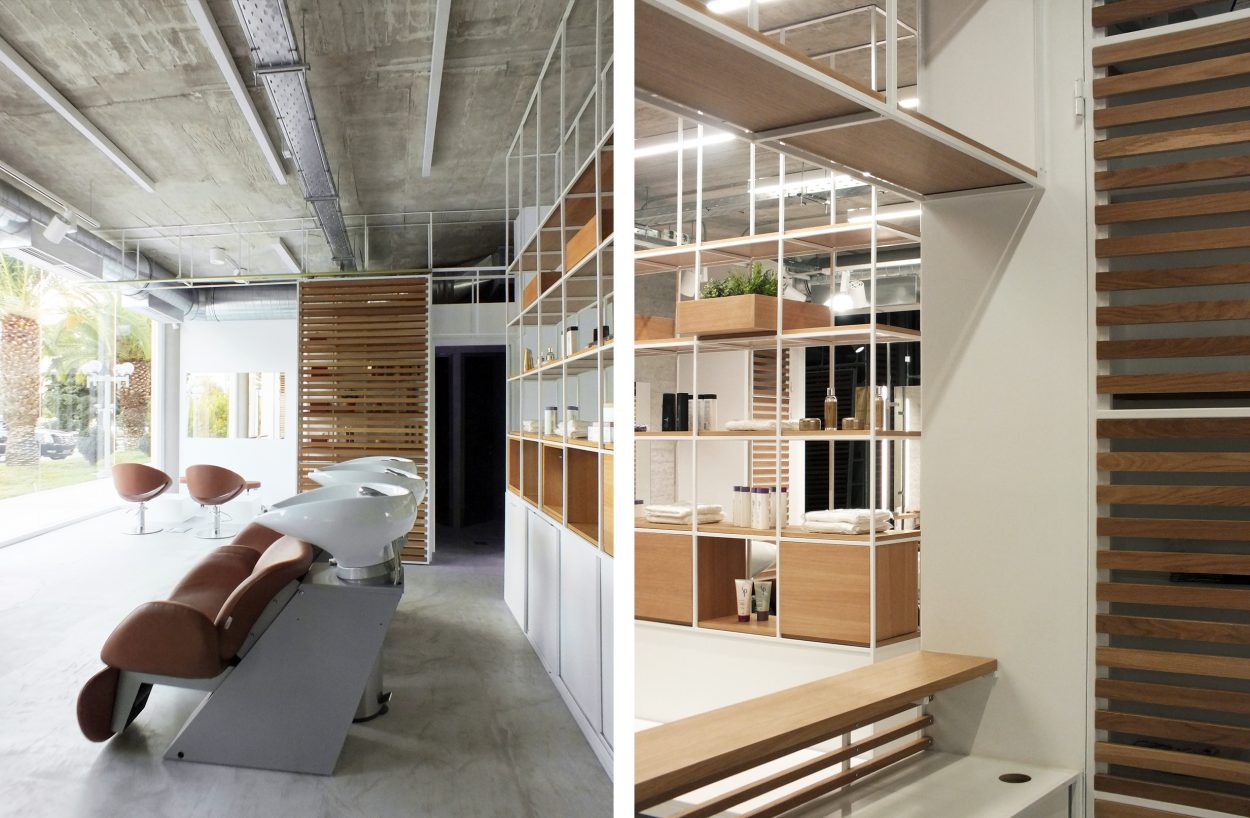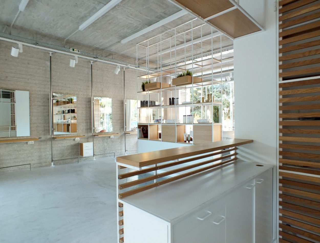 It was decided during the main review of the space, that the concrete on the ceiling and sidewall should be revealed. The ceiling was kept in its bare form, with the electrical and mechanical installations running exposed, in organized formation. The sidewall was hammered in order to remove all the pre-existing plaster markings, as well as exposing the gravels within, emphasizing on its sculptural quality and materiality. These gestures shaped the boundaries and main features of the containing shell. The internal space was conceived as a metal web, expanding in all directions, forming the divisions and functions required. A sort of multifunctional furniture containing space and its uses. Thus, keeping it as open as possible, maintaining its transparency, while allowing the natural light (a prominent feature of the space), to flow through it freely, through the use of permeable – lightweight structures and movable partitions, dividing space whenever necessary.